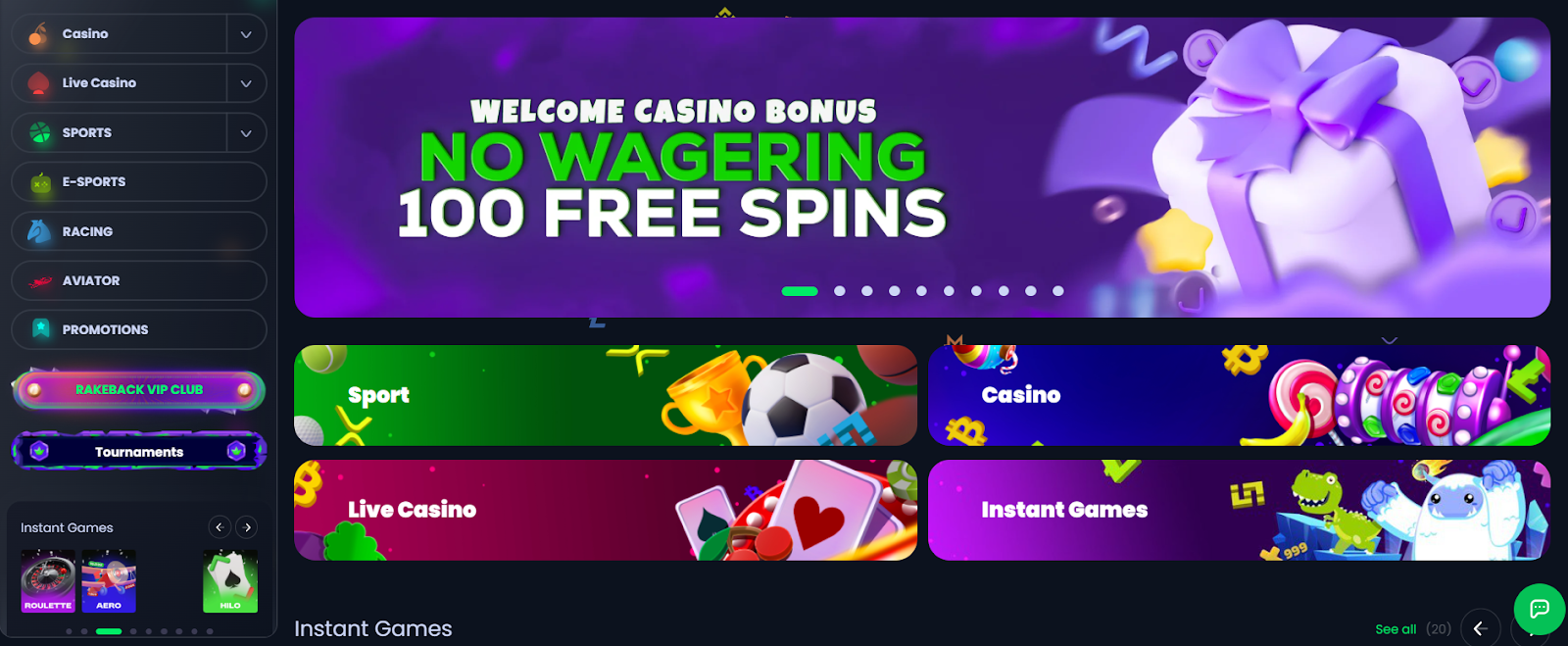 - Welcome offer: 100 free spins, wager-free